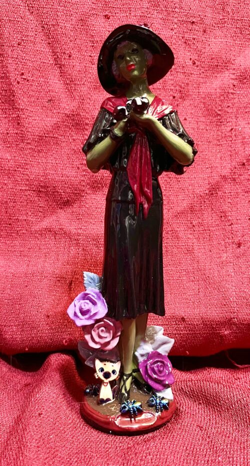 This 6 1/2 inch figurine is of Cruella de Vil, her helper and a couple of Dalmatians. It is hand painted and sealed in gloss resin. This figurine has been altered from it’s original state as kids taking care of their dogs. Cruella and her right hand man are giving the Dalmatians a makeover. One of a kind, cute piece.